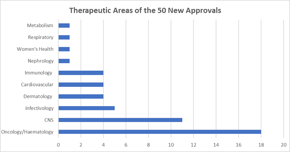 Below you will find graphs featuring the therapeutic areas of the 50 new approvals, and some of their common characteristics.
